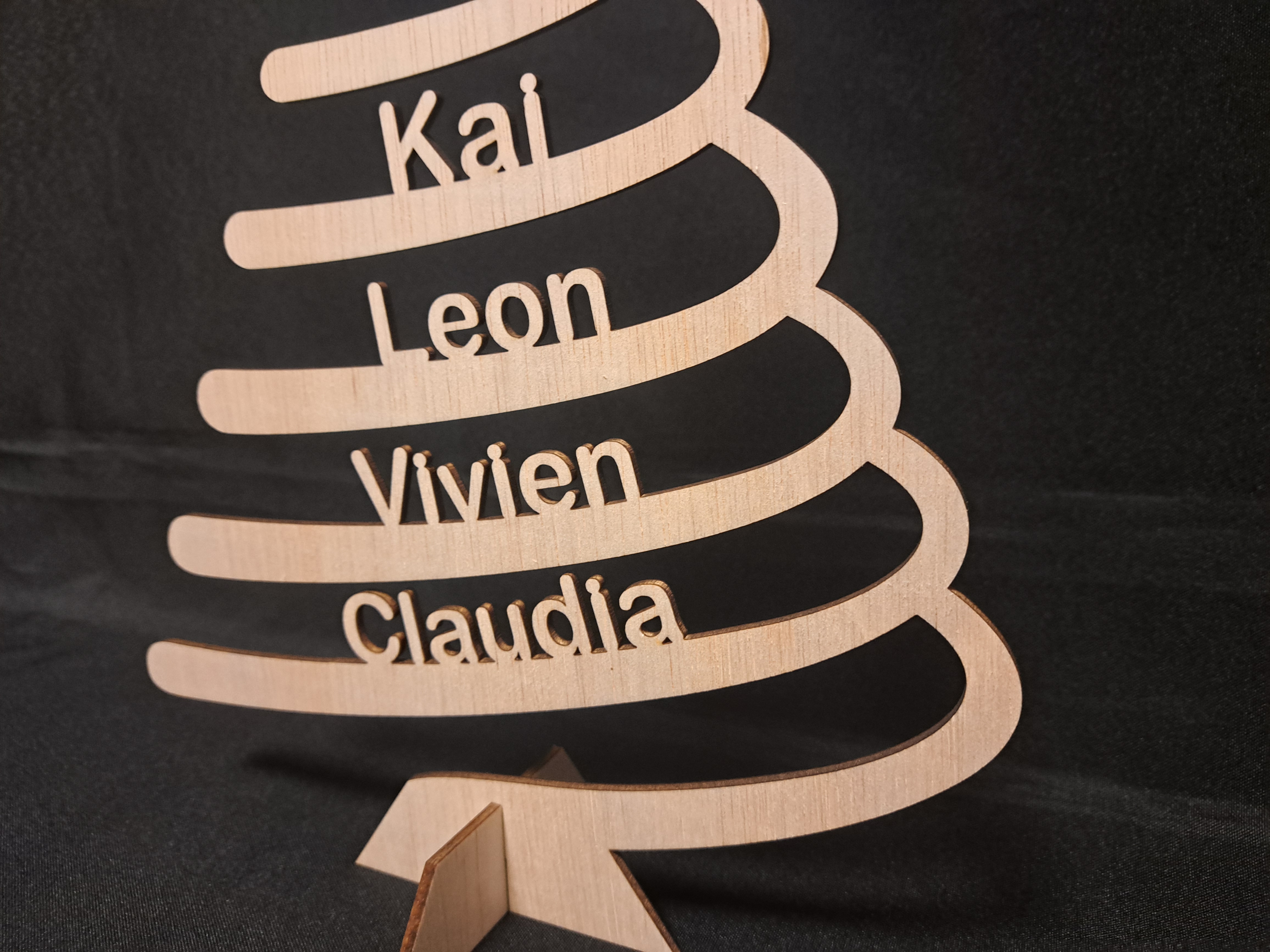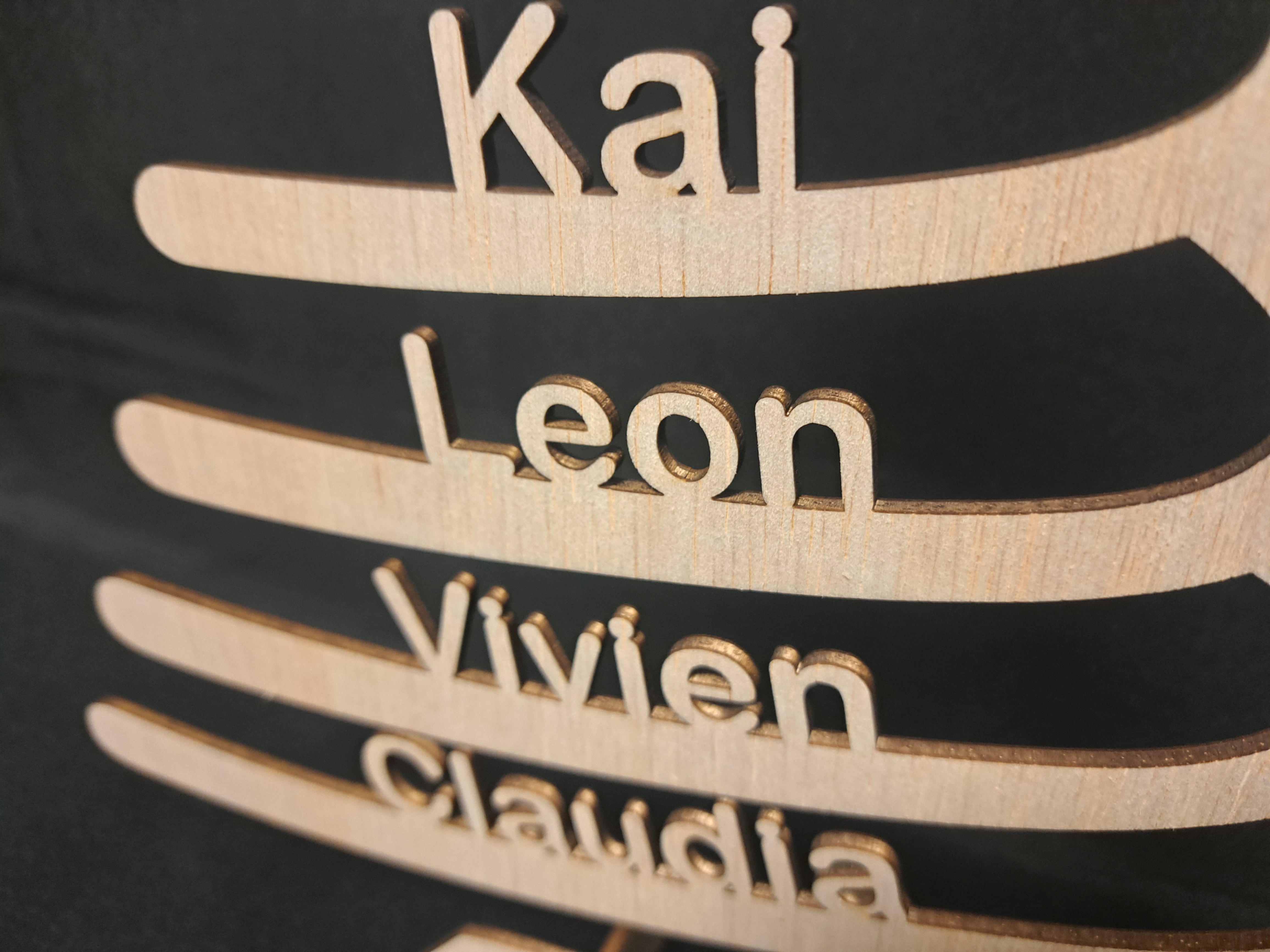 Jeder Baum wird sorgfältig aus hochwertigem Holz gefertigt und individuell mit deinen Wunschnamen gestaltet – jedes Stück ist ein echtes Unikat!
